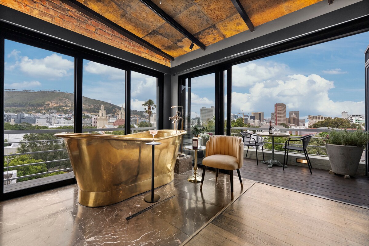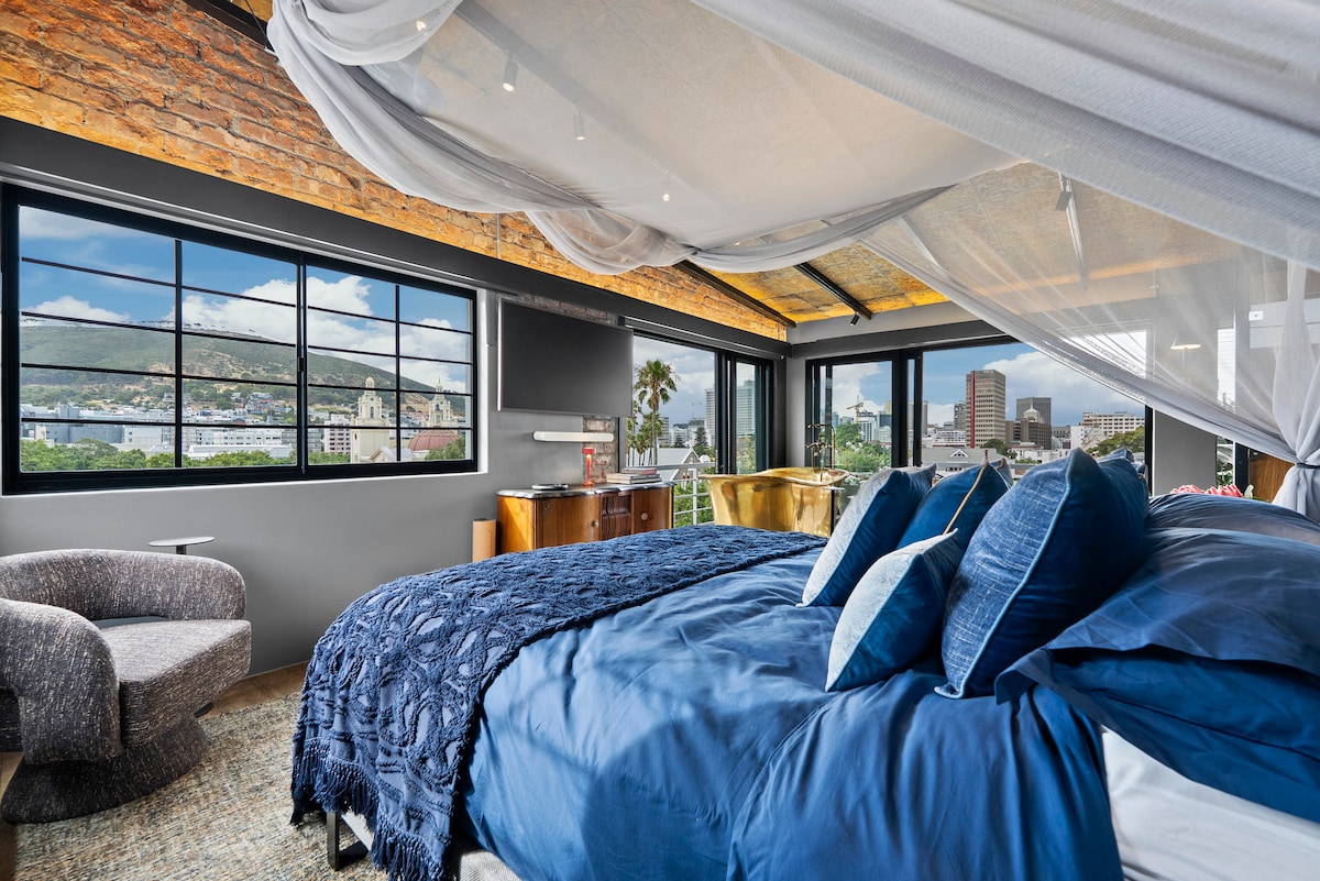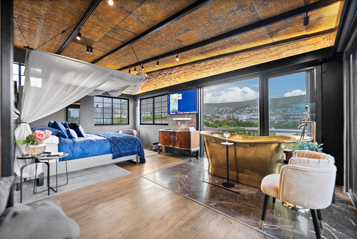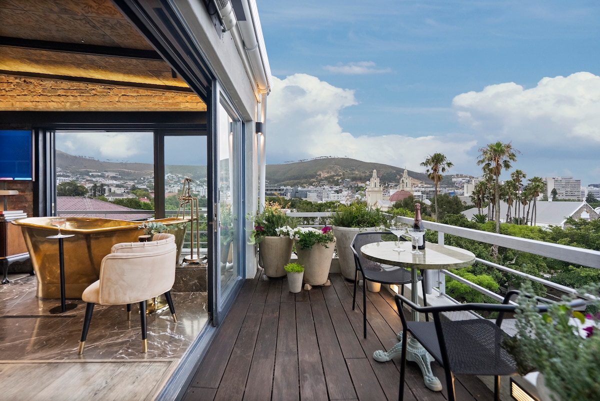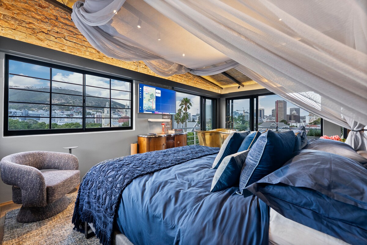 A magical home for exploring Cape Town. This centrally located penthouse is the perfect base for an unforgettable trip; fully furnished with all the comforts you could wish for – an antique bath, XL King-size bed, automated blinds, 55inch Smart TV with Netflix, a fully equipped kitchen, bathroom and wardrobes. Spectacular 270 degrees views of Table Mountain, Lions Head, Signal Hill, Company’s Gardens and the idyllic City skyline. From sunset to sunrise you will be spoilt with movie backdrops.